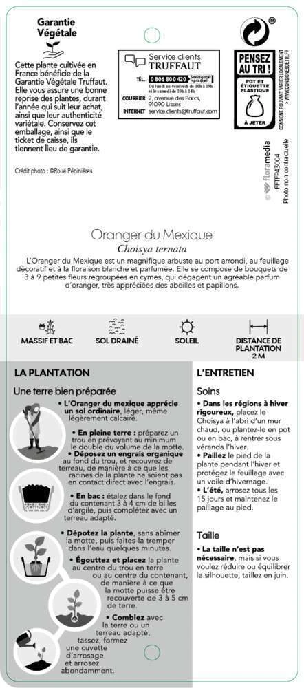 Le genre Choisya, dĂ©diĂ© au pasteur et botaniste genevois Jacques-Denis Choisy (1799-1859), comprend 7 espèces originaires du sud ouest des Etats Unis et du Mexique. Choisya ternata ou oranger du Mexique est l’espèce la plus cultivĂ©e. Cet arbuste, au port arrondi, compact, atteint 2,50 m de hauteur pour une largeur de 2 m. Feuillage persistant, rameaux vert. Feuilles de 4 Ă 7 cm, Ă folioles ovales, odorantes. Floraison blanche, parfumĂ©e, en avril-mai, remontante en aoĂ»t. Fleur de 3 cm de diamètre, ressemblant Ă la fleur d’oranger, en cymes de 3 Ă 6, dĂ©passant le feuillage. Rustique, mais ne supportant pas un froid au delĂ de -10 °C. A planter en situation chaude, ensoleillĂ©e, et Ă protĂ©ger du gel pendant l’hiver les premières annĂ©es de plantation. Pousse dans un sol normal, lĂ©ger, mĂŞme lĂ©gèrement calcaire. Exposition au soleil ou Ă mi-ombre. Supporte bien la taille pour la formation. On le plante en isolĂ©, en association dans des massifs ou haies.